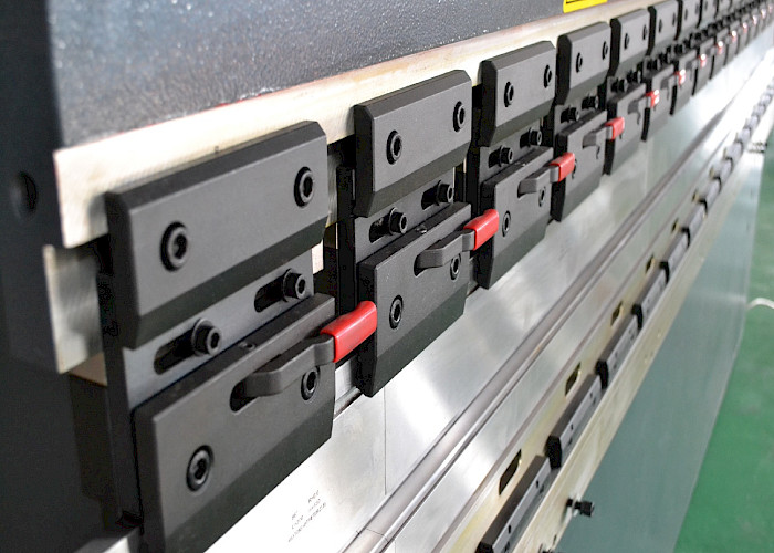 Станок оснащен быстросменной системой фиксации инструмента тип - PROMECAM. Наиболее подходит при гибке небольших заготовок сложной формы, с одновременной установкой нескольких разных сегментов пуансонов.